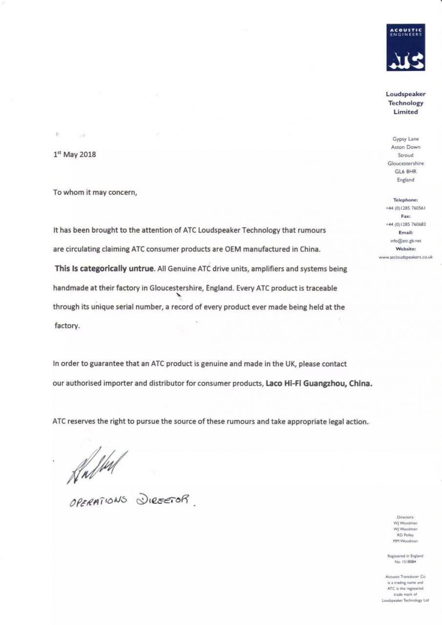 近日有傳言稱ATC 民用系列產品是在中國OEM製造的,已經引起了英國ATC Loudspeaker Technolohy公司的關注。這是絕對不真實的。所有ATC原裝驅動單元,放大器和系統均在英國製造,他們位於格洛斯特郡的工廠內手工製作。 每件ATC產品都可以通過其獨特的機身編列號進行追蹤,這是每個產品在工廠生產都會存有的記錄。ATC保留權力去追究這些謠言的來源並會採取適當的法律行動。在此呼籲各位真正喜歡音樂、喜歡ATC的廣大發燒愛好者,請認準在中國大陸,只有力高音響及其指定經銷商出售的,才是真正英國原廠製造的ATC產品,如需查詢,可致電力高公司或上ATC官方網站,查看中國經銷商目錄。