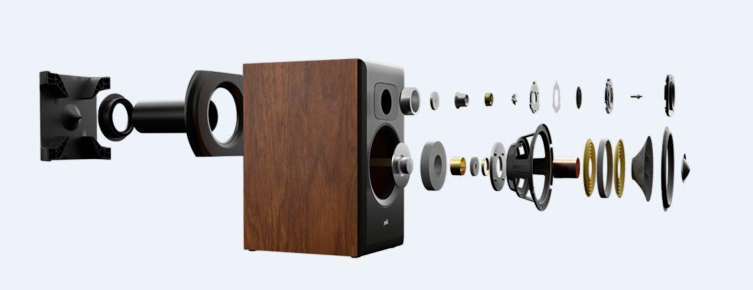 Legend系列集Polk Audio大成技术于一身,除了L800SDA-PRO特有的SDA技术之外,最大亮点有三个,分别为尖峰环形高音单元、涡轮叶片振膜中低音单元以及水滴倒流低音设计。尖峰环形高音的设计,在中间有一个尖峰椎体,以优化声扩散以及频响的平滑,这种无中央球顶的设计,解决了切割失真的问题,并且振膜轻量化而快速,通过铜帽设计来降低电感和磁通量变化,实现更高频率延伸以及更低失真,高音单元的整个密封阻尼腔,填充阻尼材料降低了内部2.5kHz的写真,并且获得更好的频响;特殊设计的涡轮叶片振膜,除了继承自家振膜材料的优势之外,立体凸起形成的涡流状让振膜的强度大大提升,让振膜在快速运动中实现比常规设计振膜低很多的分割失真,从而不必要像其它设计一样堆厚度、堆质量以提高刚性,此时涡流叶片振膜拥有相当快的速度以及低失真;水滴导流技术的设计是Polk Audio传统技术,通过在相位孔中增加导流椎体,让低音发散得更流畅,利于听感也利于靠墙摆位。