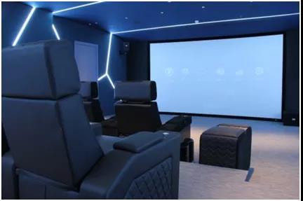 墙面内部在隔音基础上做了声学扩散和吸音处理,外饰面采用深色透声布整体包裹,墙面采用大块拼接穿插RGB-W条形灯做出造型。条形灯可以配合场景做颜色的变化,提高了整个影视厅的娱乐氛围。顶部按照展厅整体设计要求,摒弃常规的星空顶,采用了点光源加线性光源设计,配合智能综合展现各种应用场景实现灯光色温和亮度转换。一键控制的便捷操作加上选用了特殊面料的定制D-BOX影院沙发让客户能更好的享受影音生活。