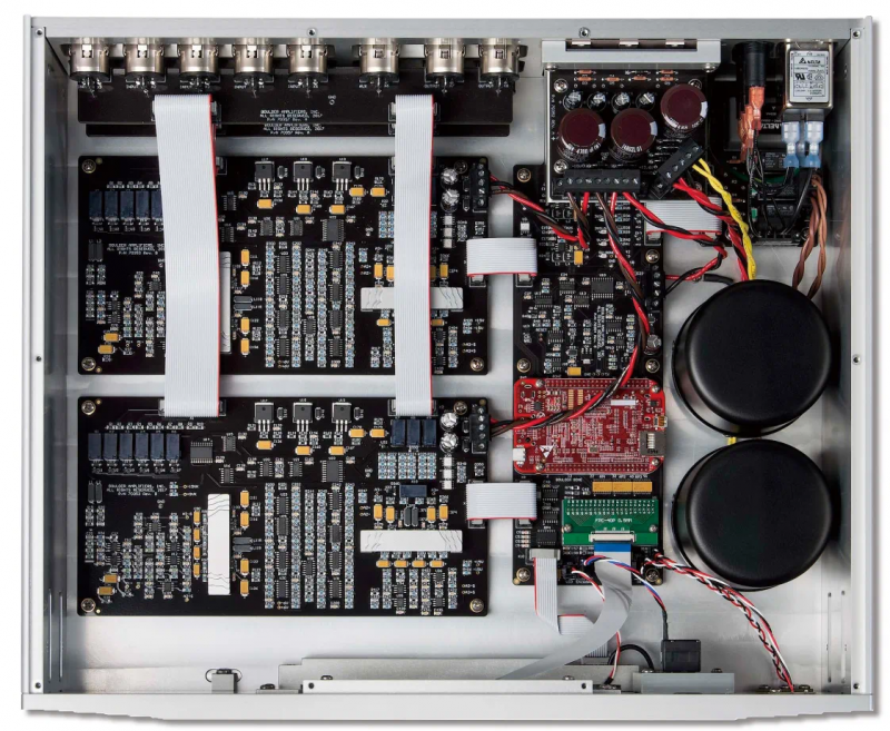 另外一个与众不同之处在于,1110前级放大器内部除了电源连接线之外,没有看到机内配线,每块线路板之间都是以扁平电缆连接,这也是与传统音响厂家的不同之处。这种方式配合表面黏着组件,优点在于可以大幅缩小线路板的尺寸,也缩短了音乐信号路径的长度,从而提高声音的纯净度。