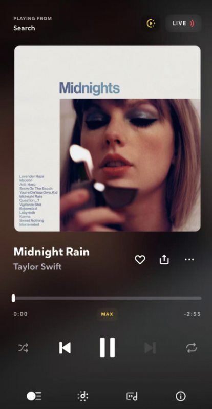 現場主要以Tidal體驗Studio多功能播放器,首先播放的是「霉霉」(Taylor Swift)2022年度錄音室專輯「Midnights」。這張專輯的錄音比較有特色,也許是為了配合專輯迷離、模糊、夢幻的主題風格,整個人聲的後期處理比較有「封閉」的感覺,節奏也比較鬆散。但是,在Studio的演繹之下,你會發現「霉霉」的歌聲在朦朧的表層之下,其實很有細膩、感性和飽滿的內核,特別是「Paris」一曲,人聲顯得格外柔美通透,呼吸吐納之間有着自然的氣息流動。伴奏音樂節奏跳躍而輕快,電子貝司富有活潑的彈性,與人聲形成了和諧的共生感。藉助極低的失真,Studio有一種「撥開迷霧」「展示真相」的魅力。