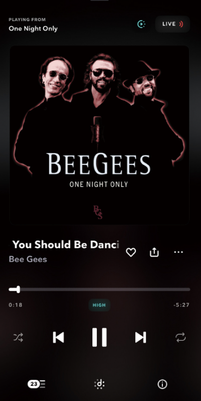 換上傳奇假聲三重唱Bee Gees樂隊1997年的「One Night Only」演唱會,Studio對於現場感的搭建和平衡控制可謂爐火純青。播放「Alone」一曲,清亮而富有金屬感和吉他聲回蕩在整個演唱會的空間之中,殘響和餘韻極為真實細膩,觀眾的尖叫聲和掌聲密密實實地向四周鋪開,保持着遠近疏密有致的距離感,瞬間就輕鬆撐出了一個三維立體空間。三位歌手的歌喉一方面配合默契,另一方面也被生動地展現出各自的特色:巴里.吉布的假聲柔美抒情、羅賓.吉布的聲音清亮激越、莫里斯.吉布的歌喉自然飽滿。這些細微之處都被Studio抽絲剝繭般還原出來,顯然也是極低失真帶來的「福利」。