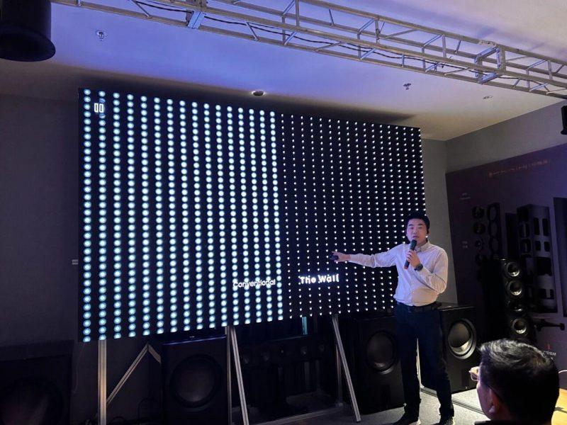 在2025年广州国际音响唱片展期间,三星展示了其高端定制市场中的明星产品——The Wall IWC系列Micro LED显示器。与羽声科技、北京天逸联手,协同包括Perlisten、麦尼塔、ATI、Outlaw等在内的多个国际知名影音品牌,在展会的540号房间内共同打造了一个顶级的家庭影院演示系统。