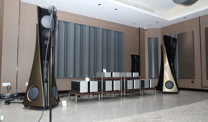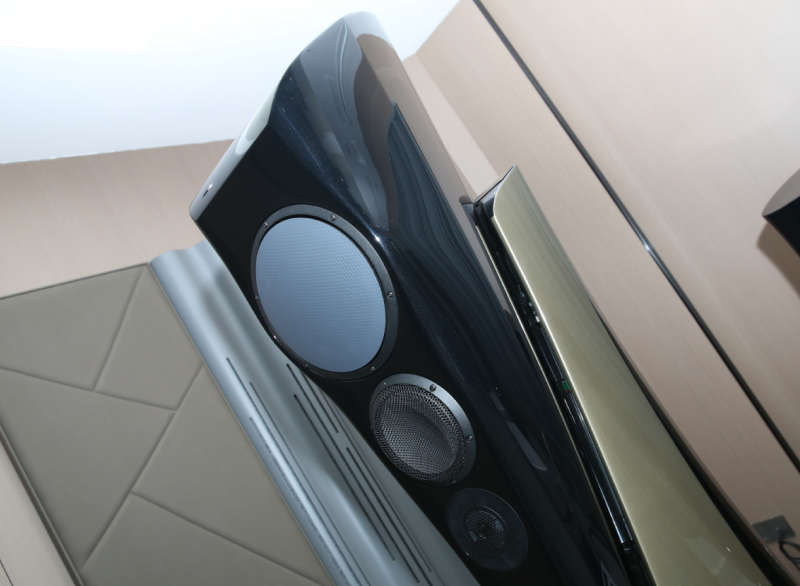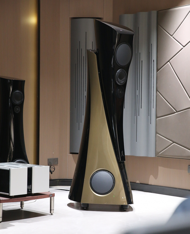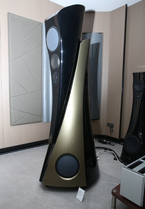 有关这次演示会的主角Extreme MKII,笔者希望了解更多其与上一代产品的区别和进化,Alfred为我答疑:对比上一代,Extreme MKII分离模块化的箱体是一体连接的,即不可拆卸的。Extreme MKII除了让中高音和低音两个箱体在工作时互不干扰、保证声音清晰干净之外,更重要的是提供了上方箱体可以根据用家需要自由升降或是前后移动的功能,从而实现了更丰富的对不同听音环境和不同听音喜好的适应性。因此,Extreme MKII座地式音箱在上方箱体降至最低时总高度为1770mm,而升至最高时则超过2m,从侧面看前面板也呈弓形,这也是为了保证高中低频段的相位一致性。Alfred继续表示,除了演示会中介绍到全新定制的单元配置外,Extreme MKII这种全弧形嵌入式箱体的设计和制造难度相当大。厂方花费大量时间研制出来的类似大理石质感的特殊复合材料一体化制成,工艺难度非常高,极为坚固,阻尼特性极佳,谐振频率超出人耳感知。同时,全弧面的箱体也最大可能地消除了箱内驻波和声波绕射、衍射造成的麻烦。
