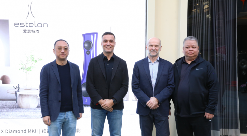 演示会后的合影留念,从左到右分别为:醇音音响总经理朱海源先生、Estelon销售副总裁Jean-Philippe Fontaine先生、Estelon品牌创始人兼设计师Alfred Vassilkov先生和广州域丰音响总经理高松盛先生