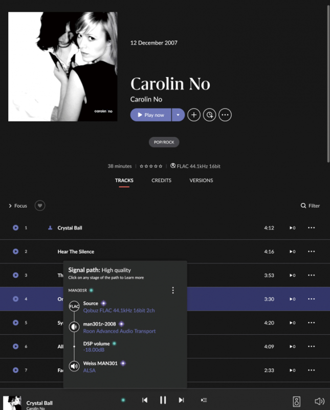 虽然是走不同的通道传输数字音乐,但这两根线的声音都有着相同的特点,那就是质感超强。播放德国女歌手Carolin No《水晶球》,片头阵阵响起的电子合成器节具弹性和跳跃感,深沉中带着一种神秘感。之后的钢琴轻灵飘逸之余,又与低频节奏交相辉映,体现出一种稳定和权威感。而当女声响起时,成熟、魅惑,极具女性魔力,有着准确而生动的胸腔共鸣,独特的气声处理更是带来甜美优雅的听感。之后打击乐和电吉他加入之后,更可以体会到高品质数字线材的优势:干净通透,声底玲珑,大音量输出之下也保持着清晰稳定的声场结构。
