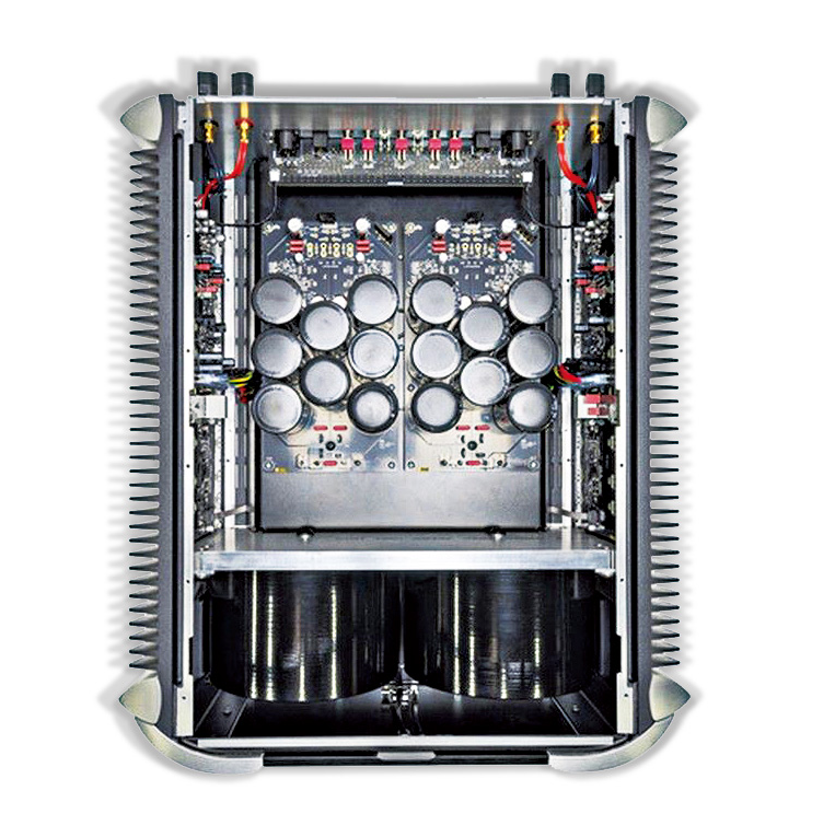 最后,双单声道全平衡架构。为确保左右声道互不干扰,861采用双单声道全平衡架构,从电源输入端便将左右声道彻底分离:机箱前段搭载两颗1500VA环形变压器,以环氧树脂密封抑制振动,再通过加厚铝板隔绝磁漏干扰;每声道配备8颗大型滤波电容,总计16颗、容量高达228,000μF,构建起“大水塘”式稳压系统,杜绝电源噪声对信号的污染。这种“从电源到放大级的全链路独立”,让左右声道如同两套独立功放协同工作,动态对比与音场定位达到前所未有的精准度。