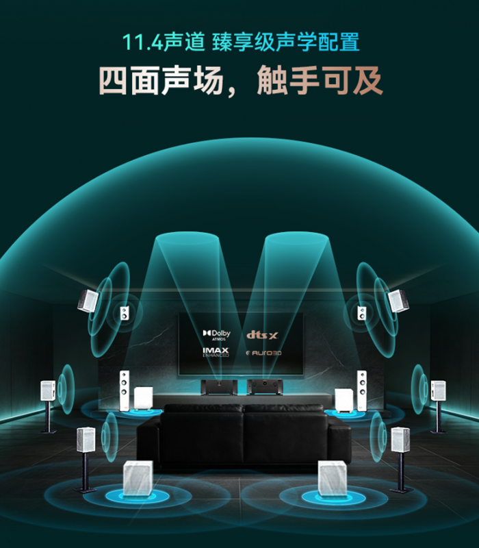 在沉浸式音频体验方面,AV 30 采用 ADI SHARC 双核 DSP 数字处理平台,并搭配 32 位数模转换架构,为多声道高解析音频处理提供充足运算余量。其可完整支持Dolby Atmos杜比全景声与DTS:X三维全景声格式,实现精准的高度声像定位与空间声场重构,并通过 IMAX Enhanced 内容支持,在动态范围、声场规模与细节呈现方面更贴近影院级体验标准。同时,AV 30 亦兼容 AURO-3D 沉浸式三维音频技术,通过高度声道与环绕声道的协同构建更具纵向层次感的声场结构,使不同类型片源均能获得更立体、更具包围感的空间呈现。