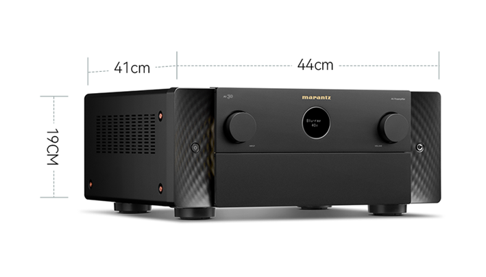 在制造与工业设计层面,AV 30由马兰士日本白河音响工坊完成制造,遵循品牌一贯的装配标准与品质控制流程。外观方面,其延续马兰士新一代标志性的舷窗式显示设计语言,并融入更具当代气质的比例与线条处理,可翻折式前面板结构在日常使用中保持正面视觉的纯粹与整洁,侧面氛围灯效则为影音空间营造更具层次感的氛围表达,随附背光遥控器亦针对暗光环境下的操作需求进行了人性化优化,使产品在功能性与空间美感之间取得平衡。