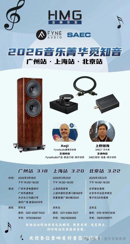 更值得期待的是,Fyne Audio董事总经理Anji、日本SAEC厂方代表上野继海先生将亲临现场,与大家面对面交流,分享他们对声音的理解与热爱。
