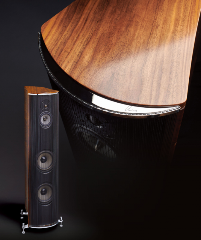 Accordo Unica是四单元三分频设计。面板上,仍然采用了Sonus Faber品牌上大家津津乐道的垂直拉丝的“面网”,上下与金属镀铬不锈钢板材固定。中高音单元方面与Accordo保持一致:由具有30年经验的丹麦工程师Ragnar Lian先生特别设计的直径29mm丝膜球顶高音单元,以及向名厂 Scan-Speak订制的直径150mm微球粒纸盆振膜中音单元,振膜表面有着多条放射状切痕,可以有效抑制锥盆工作时产生的盆裂效应,同时还采用了对称驱动系统和金属相位锥。与Accordo Essence相比,Accordo Unica为了进一步提升低频表现,低音单元改为两只直径220mm的低音单元,同样采用了微球粒纸盆振膜,并且搭配有铝质防尘罩。为了实现准确的相位和自然的音场表现。
