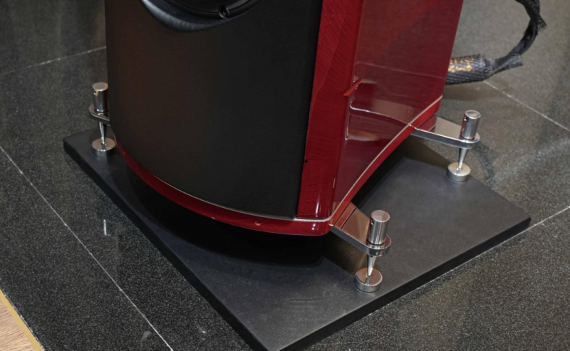 另外,所有材料的拼接的棱角边缘甚至还作了精细的凹槽处理,显然也有着消除声波衍射的作用。此后,箱体还加入了铝和不锈钢材料,以多角度消除箱体自身的谐振。箱体底部,采用了大型的非对称金属底座,配合钉脚对箱体实现稳固的支撑,即使音箱不放声时,在室内依然展现出艺术品级的美态。