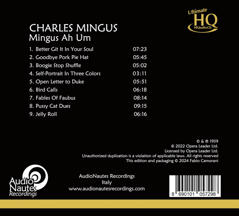 總的來說,《Mingus Ah Um》專輯的音樂創新、藝術表達與社會意識,影響深遠,啟發了許多後世音樂家探索更多元的音樂方向與社會意義。《Mingus Ah Um》最新的版本是由意大利的AudioNautes Recordings 2024年發行的UHQ CD(Ultimate High-Quality CD)。CD專輯是從原始母帶拷貝並經過全仿真處理後轉為16-bit/44kHz的格式,在日本印製限量編號的特別版CD。