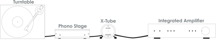 对于模拟音源也是如此,在黑胶唱盘连接唱头放大器之后,在唱头放大器和合并放大器之间加入X-Tube也能增强模拟音源的表现。而系统的前后级放大器之间,X-Tube 可用作中间缓冲级,提供合适的高输入阻抗和低输出阻抗,X-Tube 是低阻抗和高阻抗放大器输入的理想驱动器。我们甚至在多声道影院系统中使用X-Tube ,在AV接收器和功率放大器之间的X-Tube,可增强AV接收器的前置左右立体声通道,实现高保真立体声音乐聆听。