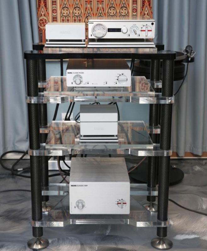 Nagra Compact系列中,去年推出的Compact PSU供电器可为系统提供卓越的升级表现,在本次试听系统中正好用于搭配Compact PlayerCompact PSU为纯线性电源设计,确保输出最纯净、最稳定的电能。Compact PSU采用多级静音滤波系统和定制的环形变压器,可见Nagra对于电源的重视。Compact PSU配备定制环形变压器和多级滤波,能在噪声低于-110dBV的超静能量中提供能量。Compact PSU供电器兼容Compact系列、Classic系列及兼容旧有系统,充裕的2A输出功率使得它轻松驱动前级等一系列器材。此外,现场搭配的还有同系列的Compact VFS减震垫板,该垫板采用了航天技术,使用一种非常特殊的阻尼材料,可以显着降低振动并吸收较大幅度的震动。