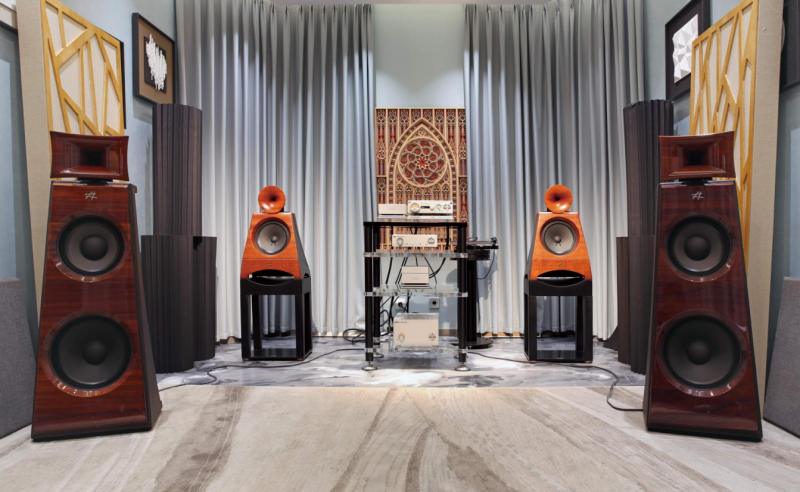 在威傲音响现场试听这套系统,采用Diesis Audio Aura号角音箱开声。这款音箱设计充满艺术感:下部是扁平的中低音箱体,中低音箱体顶部放置一只独立的号角高音单元。Aura由一个顶置的45mm号角中高音、一枚10英寸和一枚12英寸的纸质锥盆低音单元组成,在42Hz-23000Hz+/-3dB)范围内提供稳定而一致性极强的声波输出,与普通的音箱相比,独特的号角形状和大小可以实现出色的声波投射和极佳的离轴响应。