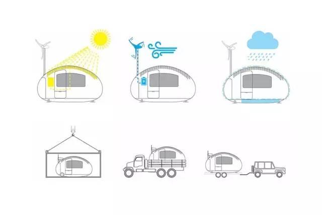 它還在伸縮桿上配置了750W風電機組,雙電源系統和一個大容量的電池,從而可以保證在太陽能或者風力減弱的環境下房子依然可以正常運作。另外,房子還有收集雨水和通過過濾系統提供乾淨的飲用水的功能。