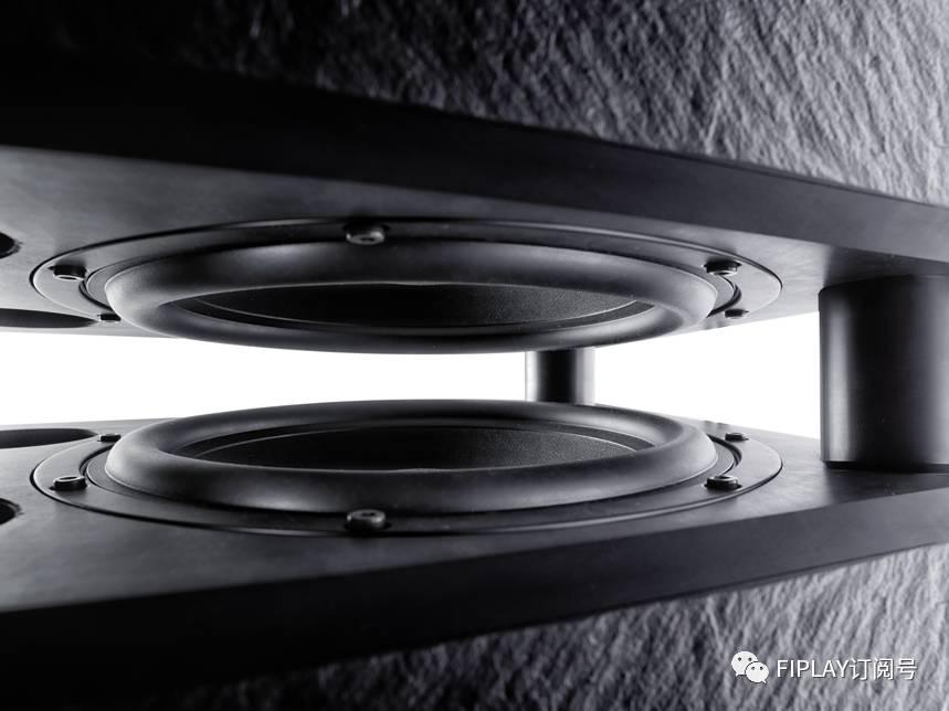 前障板单元方面,高音单元为由Mundorf特别定制的气动式(AMT)高音单元,而中音单元则为2只180mm的碳纸锥盘单元(碳箔三文治式覆膜),低音单元方面则顶部和底部2只220mm的低音单元,前障板单元实现上下哑铃式设计。而后方则还有两个“大块头”的箱体,正是由2个260mm带海绵三文治式覆膜碳纸锥盘单元所组成的超低音系统(锥盘口径上下朝向发声,同频对向令谐振得到抵消,但低频能量却增倍)。