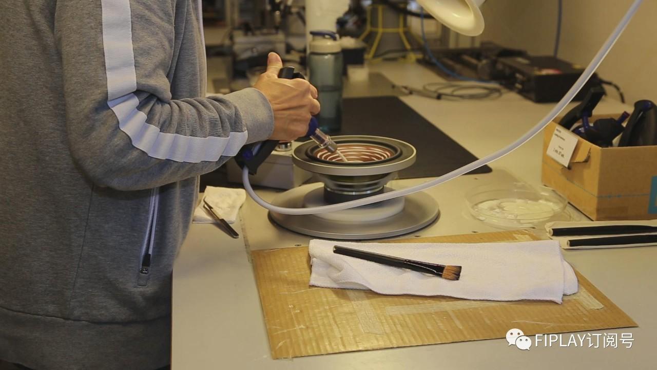 过去DALI单元都是由外部提供的,并按照公司需要规格进行订制生产,逐渐DALI意识到单元的重要性,于是陆续开发和生产有着自己专利的单元,而这里就生产着EPICON和RUBICON这两个系列单元。现场更利用机械臂对锥盆盆架进行精准地涂胶水,别小看这一工艺,若有差池对声音影响都是不可估量的;