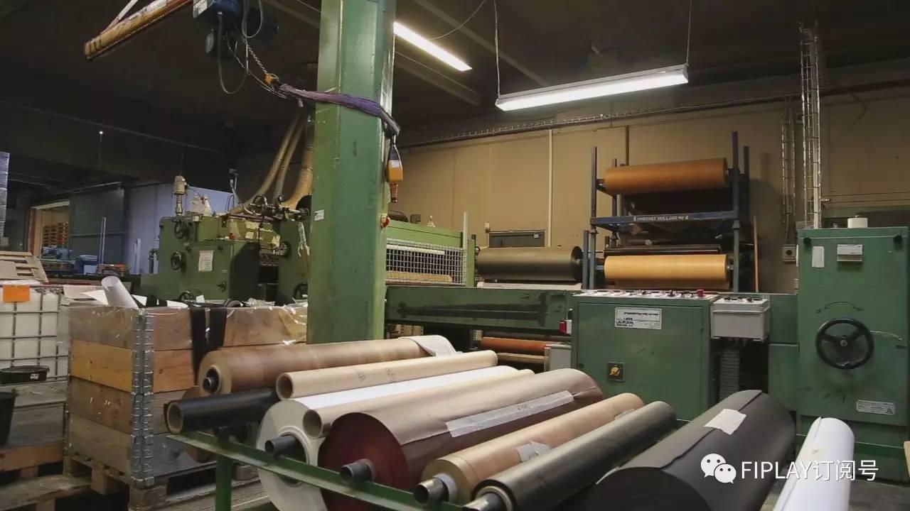 还可以看到大型切割机和众多卷的木皮,整块木皮制作需要进行严格的人手配对和检查