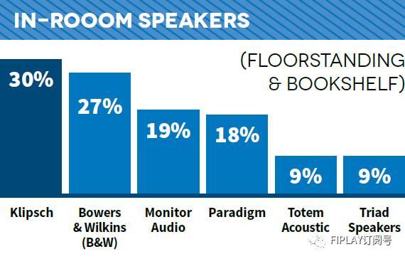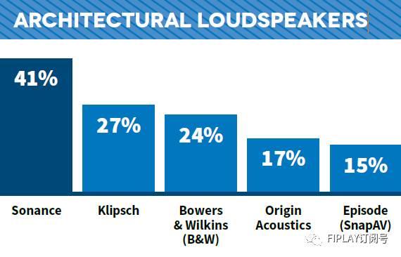 在榜单中,绝大部分的建筑类扬声器品牌的市场份额,非常稳定,Sonance和Klipsch以41%和27%稳居榜首。而在入墙式扬声器域,Klipsch的受欢迎程度正在逐渐的提高,目前已经稳居第一。