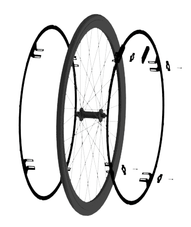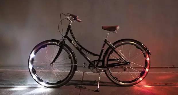 这款产品由四个窄的环形 LED 灯组成,一对儿白色和一对儿红色。这些发光组件由前后各一块可充电式电池供电,并且这块电池能直接嵌入车轮上的发光模块。
