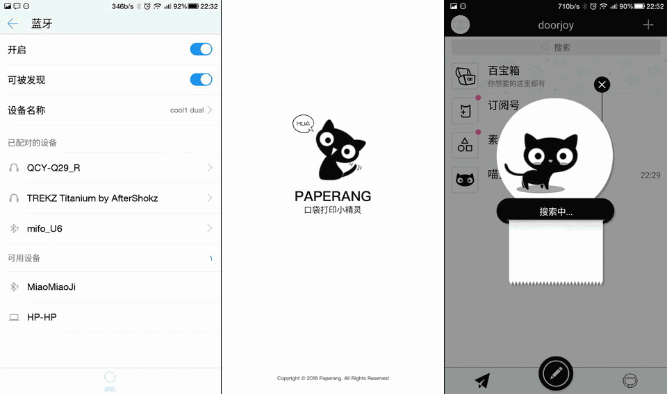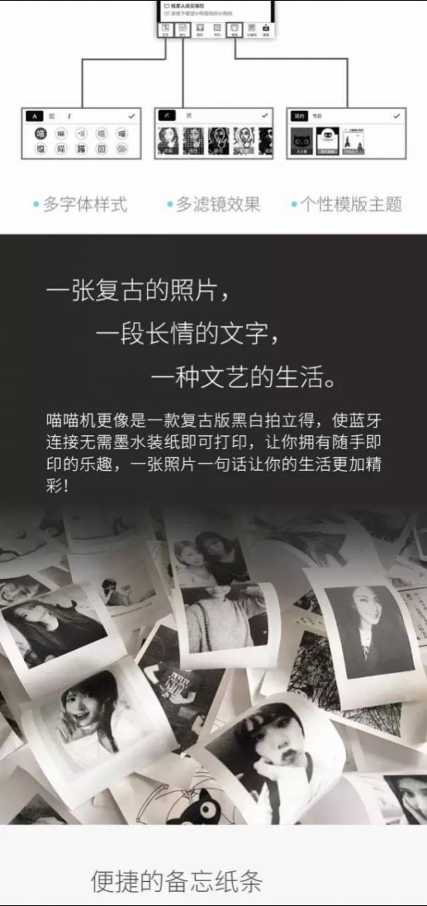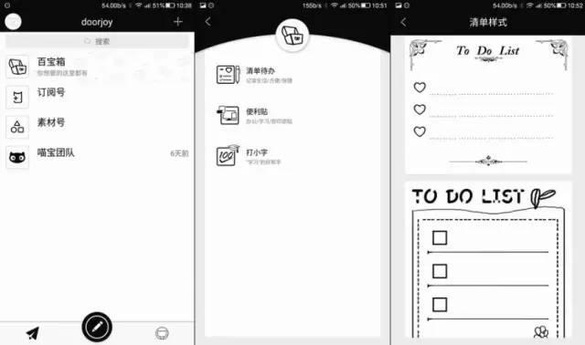 APP设计的风格也是黑白的,与其打印的风格一致,左边的页面提供了百宝箱、订阅号、素材号等功能,可以方便大家直接获取打印素材,百宝箱就是一个有实用价值的功能,可以通过清单样式或便利贴样式,快速编辑好打印文本,打出来的便签漂亮美观,独具个性。