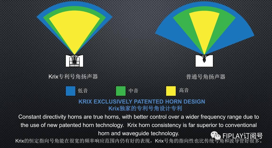 Krix的恒定指向号角能在很宽的频率响应范围内仍有好的表现,Krix号角的指向性也比传统号角和波导管好很多。