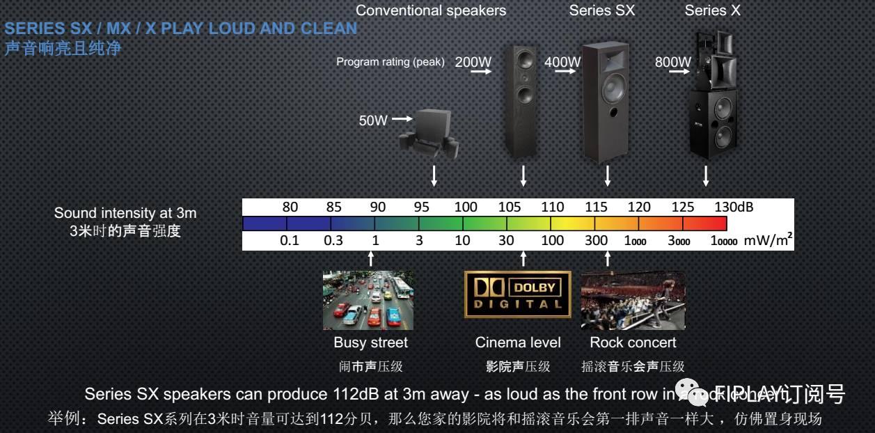 舉例:Series SX系列在3米時音量可達到112分貝,那麼您家的影院將和搖滾音樂會第一排聲音一樣大,彷彿置身現場。
