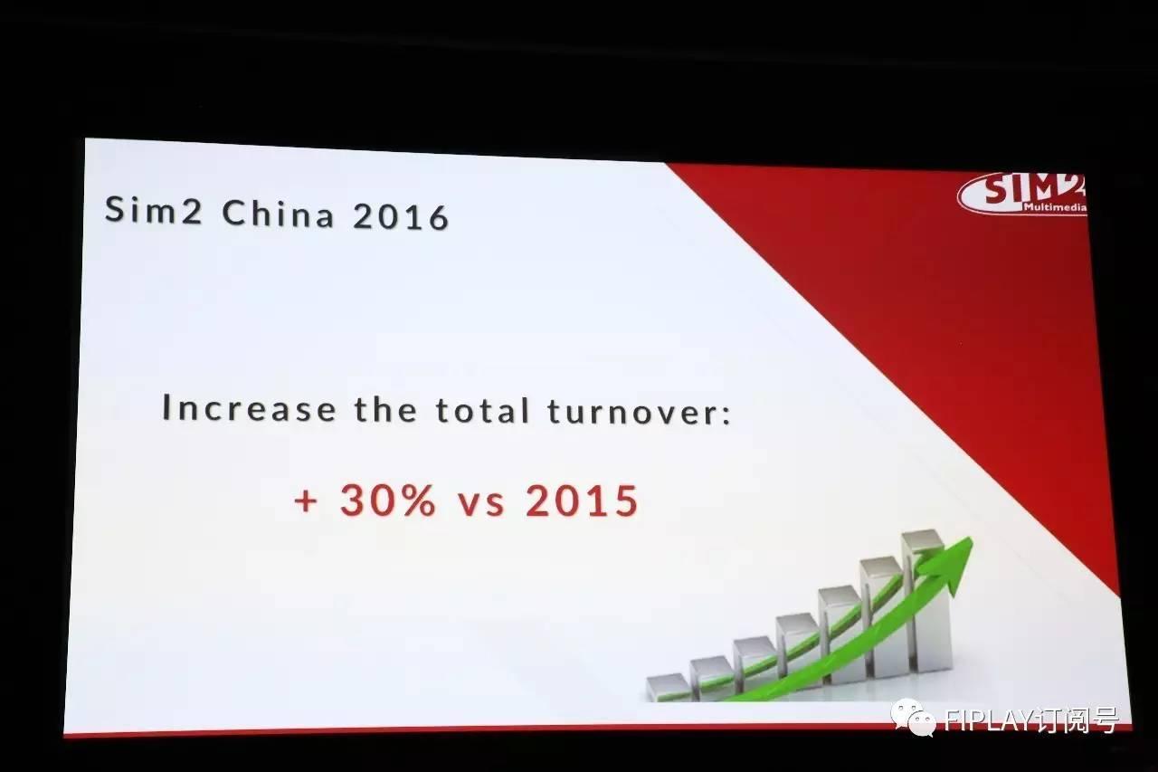 SIM2出口销售总监Massimo Zecchin先生表示,SIM2在2016年的中国营业额比2015年同期增长了30%,中国市场只是占全球SIM2出口的5%,潜力很大,会继续加大中国的推动力