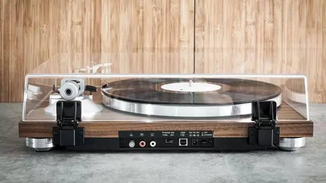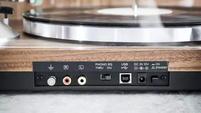 设有 RCA 输出,内置 Phono Amp 放大,另外亦支援 USB 转录黑胶唱片成 16bit/48kHz 的音乐档案,蓝牙配对按钮就设于唱盘右侧