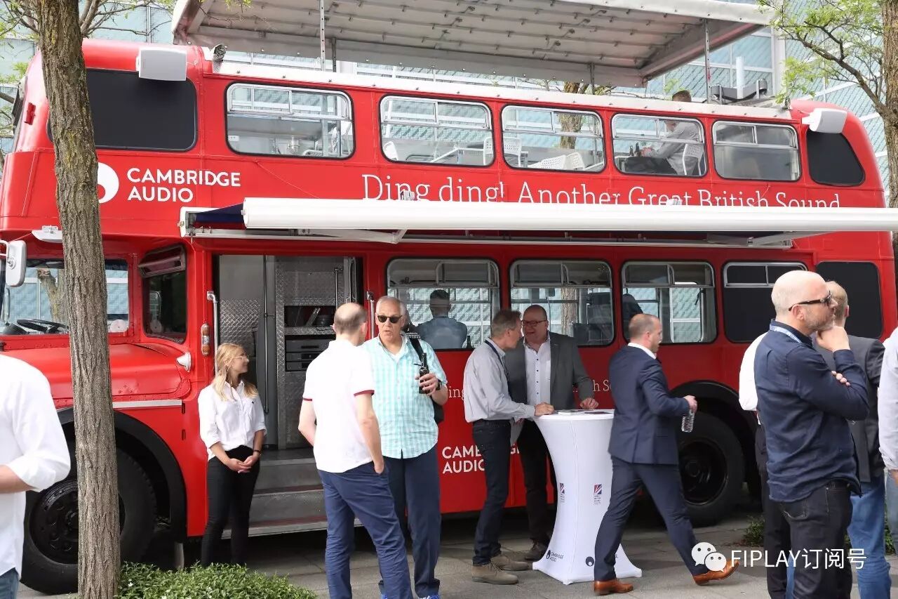 展场外还有一辆怀旧的双层巴士,车身有Cambridge Audio宣传品牌,应为作为商务洽谈区域