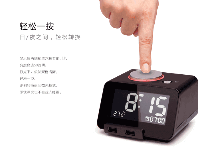 3.2英寸LED可调光显示屏,超大时钟数字高达23mm,日光下也能清晰读取时间,还可以一键转换夜间微光模式,特别针对对光线敏感的用户还可完全关闭背光。