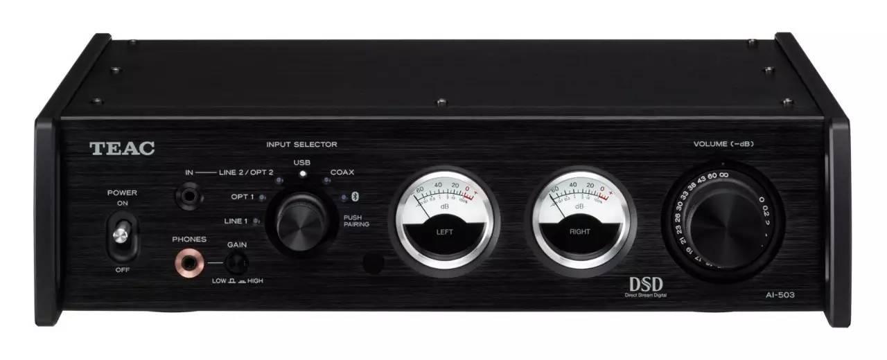 AI-503是一款集成放大器,具有USB DAC, 支持高達11.2MHz DSD和384kHz/32位PCM輸入。DAC/前置放大器是本設備的核心,遵循UD-503相同的設計理念,採用完全平衡的雙單聲道電路設計。單獨的VERITA AK4490 D/A轉換——由Asahi Kasei Microdevices公司製造——用於左右聲道。除了支持USB數字輸入(用於Windows/Mac計算機),光纖/同軸數字輸入和RCA模擬輸入外,還可以通過LDAC兼容的藍牙® 接收器實現了高分辨率無線音頻收聽。此外, 通過前面板上的3.5毫米光纖數字/立體聲迷你插孔,該設備支持DAPs有線和無線的輸入。功率放大器使用D類功率放大器(由ICEpower a/s製造),這個確保在精密信號的播放過程中的高分辨率和高音量的高線性度。本設備可以為緊湊型書架式揚聲器(適用於台式機)和大型的落地式揚聲器供電。前置放大器採用了4電路結構的完全平衡的TEAC-QVCS高精度音量來控制電路。通過保持所有分辨率的細節電平,AI-503創建了非常逼真的聲場,以及高信噪比和優秀的空間感。通過將外部功率放大器連接到已安裝的預輸出插孔,您可以升級性能並創建更強大的音頻系統系統。耳機放大器部分採用分離的TEAC-HCLD電路,採用推挽式布線,可輕鬆驅動高阻抗耳機。兩級高/低增益開關可實現從低阻抗入耳式監聽器到高阻抗(600Ω)入耳式耳機的一切優化音量設置。此外,3.5毫米的耳機插孔支持4極分離接地連接,即使使用平衡式頭戴式耳機或耳機也能實現極佳的聲道分離。