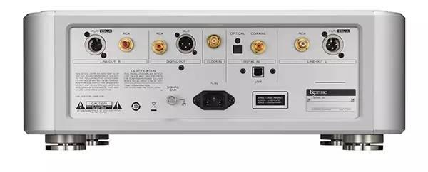 机身的数类转换部分内建了8组差动电路与左右声道独立的DAC,采用AKM最高级的32bit AK4497晶片,及特殊的35bit运算处理器,可让运算上的误差维持在最小程度。类比输出除了一般的XLR和RCA端子外,还提供全新的专用传输方式「ES -Link Analog」,其HCLD缓冲电路具有高速且强大的电源供应能力,让信号在传输路径上不容易受到阻抗影响,使类比传输效果发挥到极致,适用于连接自家器材。