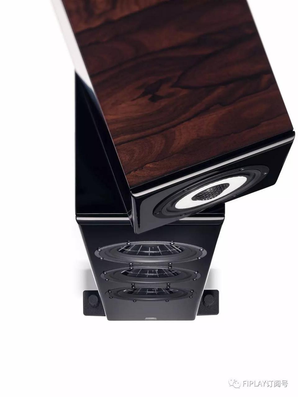 而在下方的低音箱体中,安装了三只直径七英寸的专利X3P蜘蛛锥盆低音单元,由德国著名单元生产厂家ETON代工。而在这三只低音单元任务分配方面,厂家又进行了创新:低音箱体内部有七组加强结构将箱体分割为两个腔体,分别放置一只和两只低音单元,均设计有倒相孔。其中一只低音单元负责与中音单元进行频率衔接,另两只低音单元并联工作负责低频下半段。