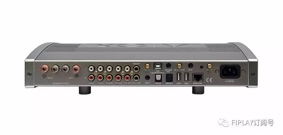 作为Cary Audio高度一体化的最新产品AiOS多功能音乐播放一体机,集成的不仅仅是解码和放大这么基础的功能,而是将目前最流行的串流音乐和无线传输等多种功能内置其中,相当符合“All in One”这么一个理念。首先,大家通过机身背面的插口图就能够知道,AiOS配备了RCA、同轴、光纤、USB、网线等等这些模拟和数字接口,在旁边还配备了扬声器输出端子,而其输出能力每声道75W(8Ω)和125W(4Ω)亦能应付不少扬声器产品。所以除了能够应付影音爱好者的讯源设备外,即便是游戏机、电视机等日常使用的电子设备AiOS都能够支持连接。