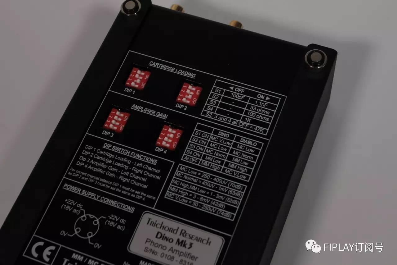 不管用家是使用低电平的MC唱头或是高电平的MM唱头,Dino Mk3都能轻松应对,所有的设置都隐藏到机器底部,使用前只要翻转底部进行合适的选项调节即可:包括Cartridge Loading唱头负载调节选项和Amplifier Gain放大增益(右边空白处还有一个说明表格)。DIP开关位置分别有DIP1和DIP2,可以对此进行唱头左右声道的容抗和阻抗负载进行调节;而DIP3和DIP4则对应左右声道的放大进行增益调校。S1-S4对应DIP上4组开关选择,当唱头容抗是100pF(MM)时则把DIP1和DIP2上的S1-S4全关掉OFF。如果是1.1nF(MC)则把S1打开ON,S2-S4关掉,此时默认阻抗为47KΩ,如此类推,33Ω和100Ω及1KΩ则仅让S2、S3、S4打开ON。值得注意的是,上述操作DIP1和DIP2必须一致。