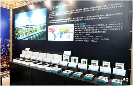 此展區右側牆面除了有各種不同長度FIBBRUltro-Pro及Pure系列光纖HDMI線材實品展示之外,後面的廣告牌則點出FIBBR是高科技尖端技術之結晶。FIBBR是由全球最大光纖光纜廠「長飛」和亞洲實力最堅強的台灣「威盛」芯片公司連手打造的,除了使用BendRobust專利特種光纖之外,更將原本只能在中大型設備使用的光電轉換技術濃縮成小於0.0001平方米的面積內,並以極低的功率耗損及極高的效率運作!