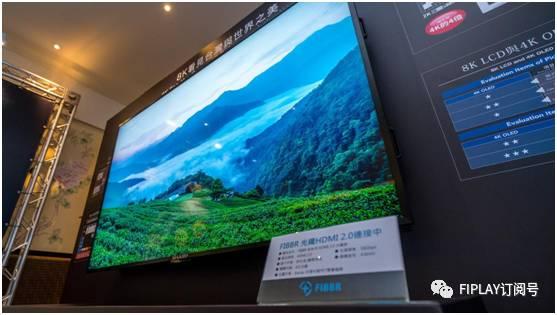 唉呀,本站廖斐森總編輯在拍攝這張照片時不小心入鏡了(請看Sharp4K電視畫面右下角)!原來「精研國際」展房內用角落的這部8K攝影機做實時影像拍攝傳遞,各位有注意到攝影機腳架頂部附近那捆線材嗎?沒錯,那是一捆FIBBR Pure系列長達50米的光纖HDMI線材,由攝影機拍攝之影像就透過這條FIBBR Pure系列50米光纖HDMI線,直接送入Sharp 4K電視顯示,證明FIBBR光纖線在50米或甚至200百米長度的狀況下都可完美傳遞18Gbps4K60p 4:4:4影像信號。