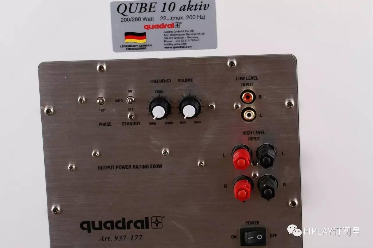 作為一款10英寸的超低音揚聲器,QUBE 10 AKTIV的分量也是挺重的,重量達到了16.5 公斤。QUBE 10 AKTIV是一個低頻反射式的設計,單元被設置在了下方,通過地面的反射來把低頻傳輸到空間的被一個角落。故此,在相位調節上,Quadral也是給出了0°或180°選擇設置,方便用家在客廳前後放置超低音揚聲器的選擇。