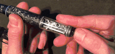 而在钢笔里,按一下笔身末端机芯触发按钮。通过一系列不可描述的的机械效果,几秒之内就能将笔尖推出。