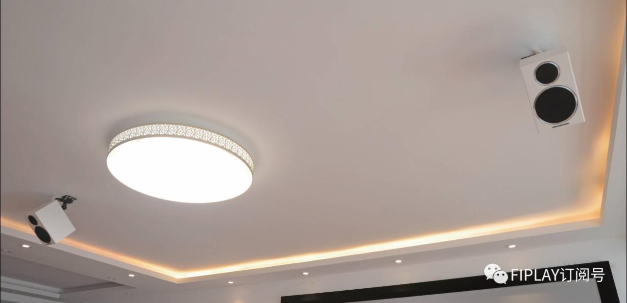 由于客厅高度为2.58米,全景声设计调整便会变得很有限,不能做整体吊顶,因此全景声扬声器无法使用吸顶的嵌入式扬声器。不过仍然无法阻挡设计师组建杜比全景声的步伐,本次选用的Wharfedale钻石210小型书架式扬声器作为天花置顶声道,Wharfedale钻石210背部有安装螺孔,配合设计师特别挑选的多轴可调吊装架,便让这一对纯白色钢琴漆饰面的钻石210作为客厅内的全景声扬声器,吊装至天花板,并且与天花板白色基调相融合。扬声器系统的左中右扬声器、环绕扬声器以及超低音扬声器都使用了经典黑色钢琴漆风格,与房间整体的整洁简练的风格相搭配,配以天花板上的纯白色钢琴漆全景声,每一个细节都会考虑与房间风格和色调的和谐搭配,这无一不体现了设计师的细致用心。