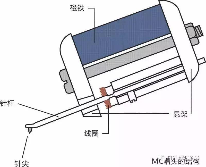 動圈唱頭(MC,Moving-Coil Cartridge)就是活動音圈的意思,一如動磁頭的針尖及針桿結構,但只是唱針尾不是安裝磁石,而是安裝線圈,而針桿活動帶動線圈,磁石就固定在線圈左右,針桿帶動線圈而受磁石感應線圈出交流電信號而發聲,這就是動圈的原理。由於針桿的動能很小,線圈也只能用很經很細線圈,所以線圈感應交流電信號很小,約只有動磁頭的十份一,即0.1至0.4mv左右,由於輸出很細,所以動圈頭而在傳統唱頭放大上再加入放大器,即前級放大器或升壓變壓器。由於線圈是連結在唱針尾,所以即使唱針損壞後亦不能獨立拆下唱針更換,一般要運回生產廠商才能更換,這亦是動圈唱頭不便之處,動圈唱頭由於發聲線圈是直接感受振動而發聲。(圖2-1)丹麥的Ortofon公司的動圈式唱頭為代表之作。