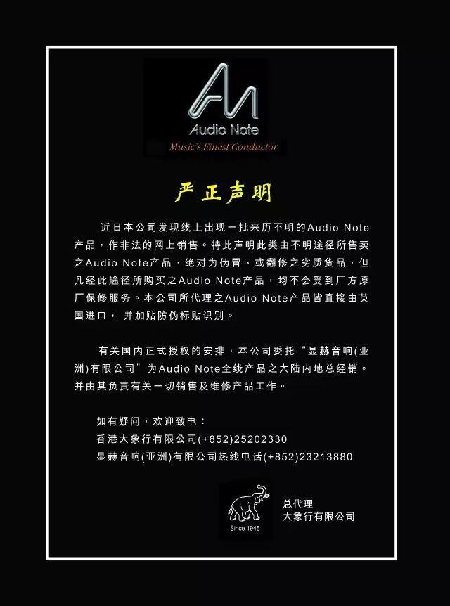 近日大象行有限公司發現線上出現一批來歷不明的Audio Note產品, 作非法的網上銷售。特此聲明此類由不明途徑所售賣之Audio Note產品, 絕對為偽冒、或翻修之劣質貨品, 但凡經此途徑所購買之Audio Note產品, 均不會受到廠方原廠保修服務。大象行有限公司所代理之Audio Note產品皆直接由英國進口, 並加貼防偽標貼識別。有關國內正式授權的安排, 大象行有限公司委託「顯赫音響(亞洲)有限公司」 為Audio Note全線產品之大陸內地總經銷。並由其負責有關一切銷售及維修產品工作。如有疑問,歡迎致電: