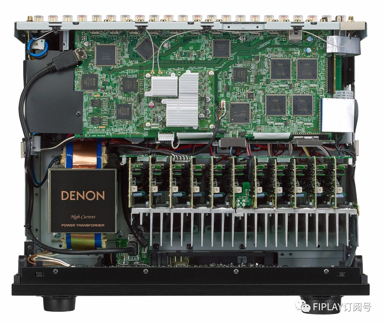 AVR-X6400H甚至在设计和构造中考虑到如下因素:11声道功率放大器模块的每个声道具有独立的放大器板——整体式构造,而各放大器的电源和输出连接口都等长,实现精确的信号匹配。各放大器采用了差分晶体管,获得稳定、一致的性能,并采用Denon的定制高电流晶体管保持温度的稳定性。AVR-X6400H甚至采用了更大的电源变压器和宽大的5 cm直径电容器,以提供更大的功率储备。