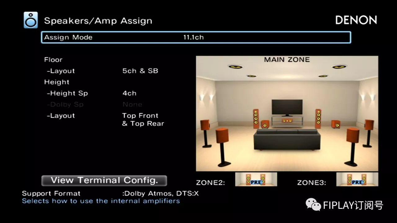 AVR-X6400H的设计规格为11个放大器声道,每个均提供205W(6 Ω,1 kHz,THD 1%,单声道驱动),开箱即可实现高达7.1.4的声道设置。此外,在简单的环绕声系统中,放大系统可以配置为5.1声道双放大模式,每个扬声器均由两个放大器声道驱动以获得更好的清晰度。