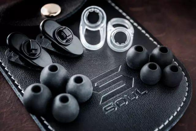 跟机附送不同的耳胶和耳勾,还有线夹和耳机专用仿皮便携袋。