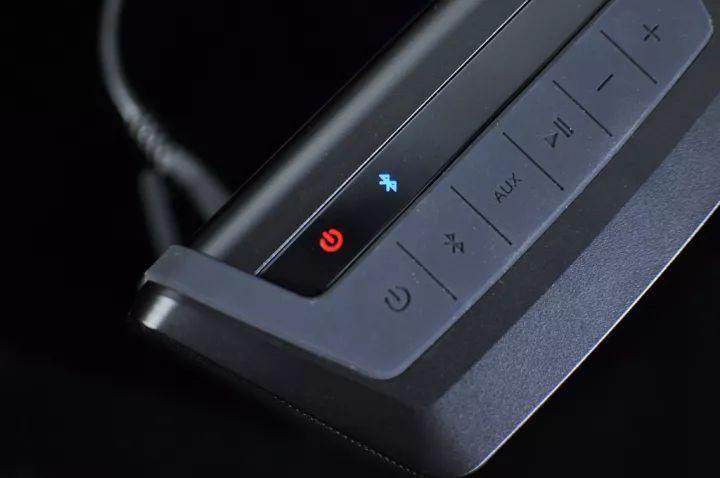 机身顶部比较有个性,首先从造型上看得出来是个喇叭造型(较宽的为正面),声学传播基本原理之一哈;再者顶部除了橡胶软体按键,还有一排LED灯。