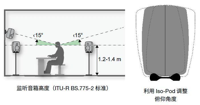 对于典型的二分频监听音箱,音箱声轴高度应与耳朵平齐,通常距地面 1.2 至 1.4 米。将音箱置于更高的位置,并稍向下倾斜,可以减少地面反射的影响。对于标准的立体声和多声道重放,请勿将音箱置于过高的位置上,声轴俯角应小于 15°。音箱需要始终指向听音点。音箱设置的越高,地板反射对于频率响应的影响越小。但需要注意,天花板也会造成低频反射,请勿将音箱置于超过层高一半的高度。